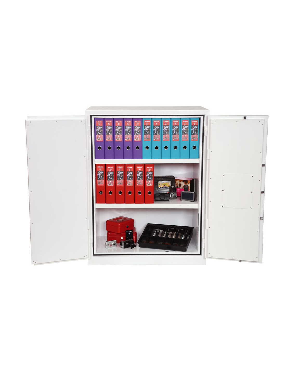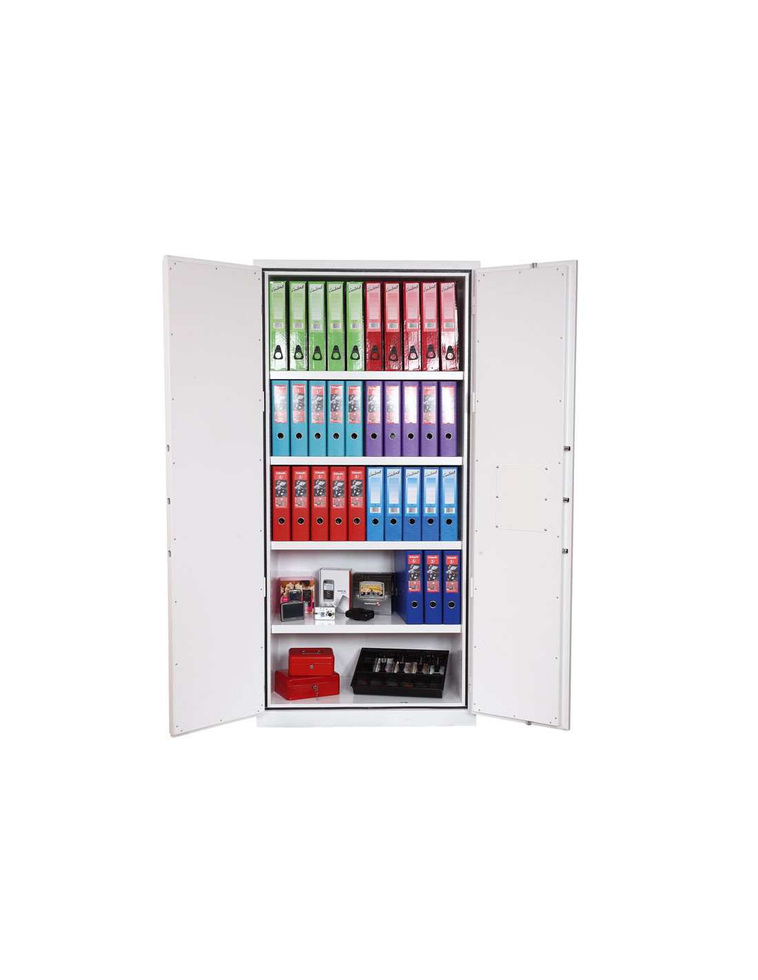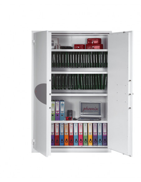 Cette armoire forte antivol et anti-feu est fournie avec 2 étagères réglables en hauteur qui incluent également des rails de suspension pour les dossiers latéraux en standard.