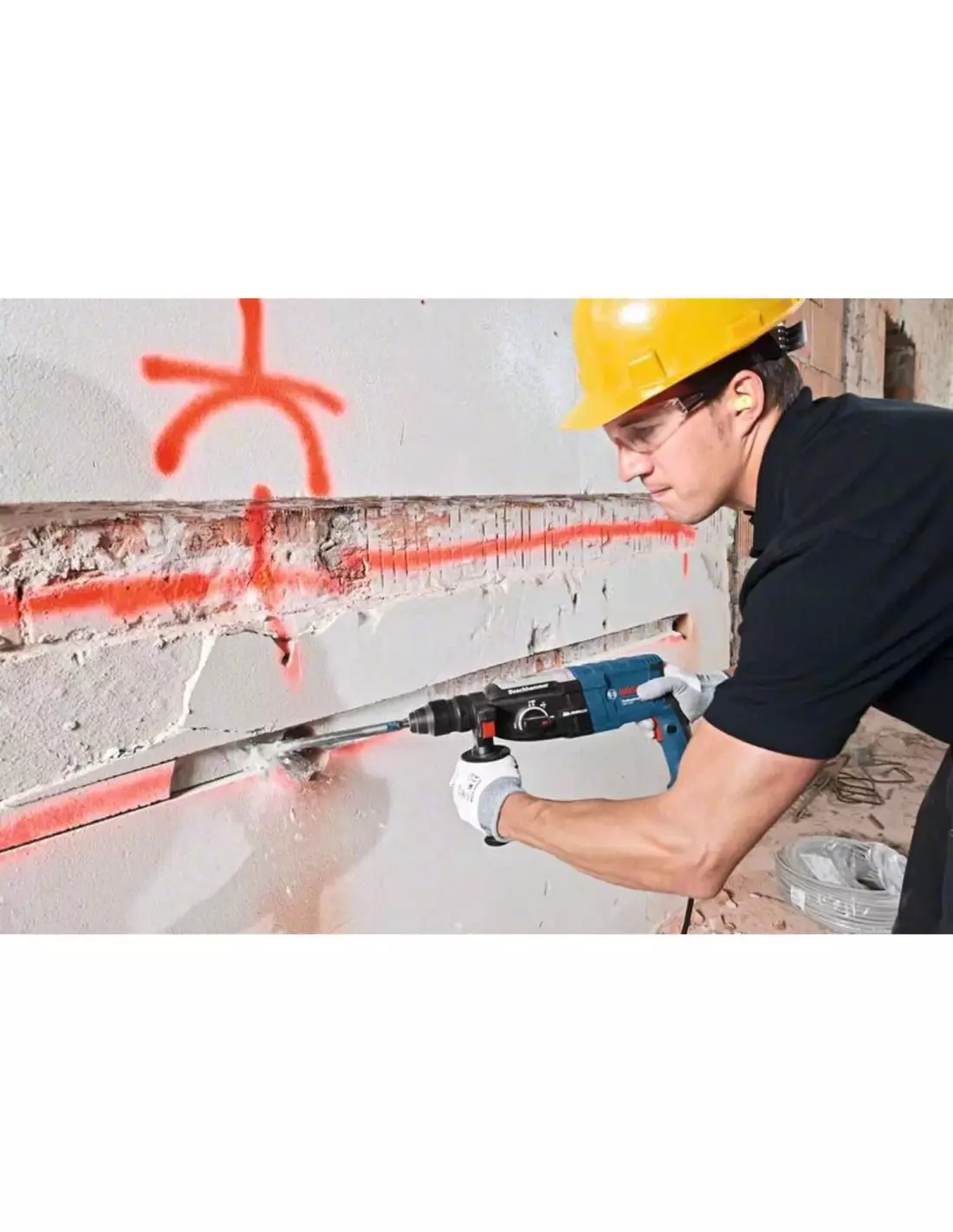 Le gbh 2-28 f professional avec mandrin interchangeable est le modèle le plus puissant de la gamme des perforateurs sds plus filaires bosch de 2 kg. il dispose d'un puissant moteur qui délivre une force de frappe de 3,2 j, idéal pour percer tout en puissance. il est équipé d'une fonction kickback control pour une meilleure protection de l'utilisateur. cette machine bénéficie également d'un système vibration control pour une utilisation prolongée sans effort lors de travaux de longue durée. cet outil bosch est conçu pour les applications de perçage et burinage dans le béton, la maçonnerie, le bois et le métal, et est compatible avec divers dispositifs d'aspiration de poussière. enfin, le gbh 2-28 f professional procure une réversibilité droite/gauche et un embrayage de sécurité avec un variateur de vitesse et une fonction vario-lock.
