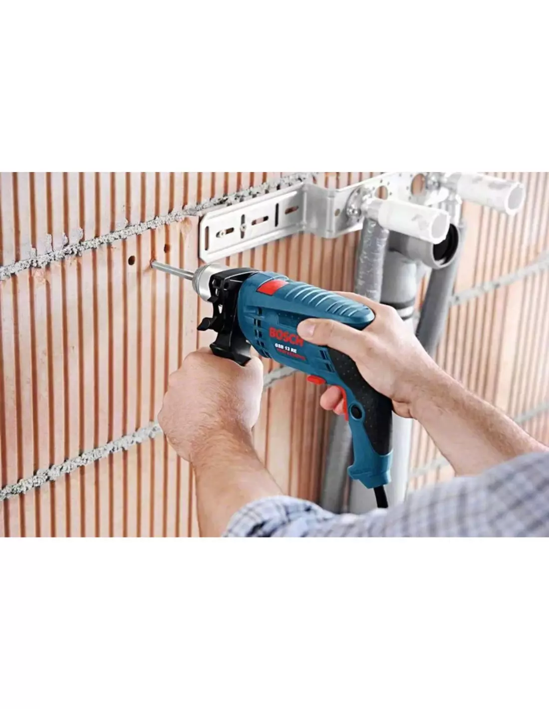 La perceuse à percussion GSB 13 RE de Bosch est une machine polyvalente permettant le perçage dans la maçonnerie, le béton et la pierre. Son carter compact et son mandrin automatique entièrement en métal garantissent à la fois légèreté et robustesse, pesant seulement 1,8 kg pour une prise en main parfaite et une excellente maniabilité.