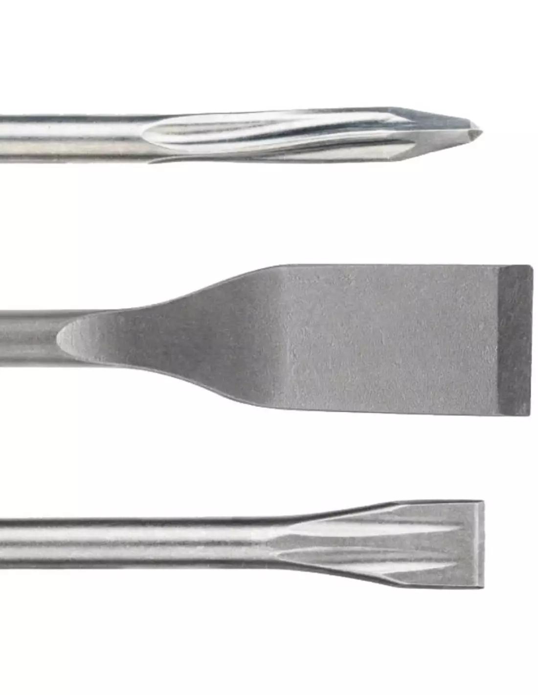 Ce set de burins Sds plus est composé de 3 pièces dont un burin plat, un burin pointu et un burin carrelages. Le burin plat est doté de cannelures puissantes créant des fissures latérales et verticales dans le béton tandis que le burin pointu est équipé d'une pointe courbée garantissant une plage d'enlèvement de la matière large et un risque de blocage moindre. Le burin plat coudé permet de retirer les carrelages sans les casser. Par ailleurs, ces burins offrent une longue durée de vie et sont compatibles avec les marteaux Sds plus munis d'un stop de rotation. Avec ces outils, le taux d'enlèvement de la matière est élevé et le blocage est réduit.