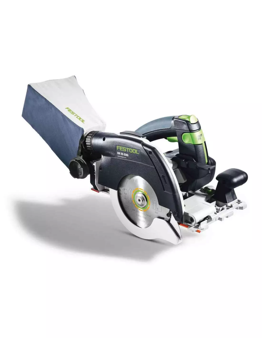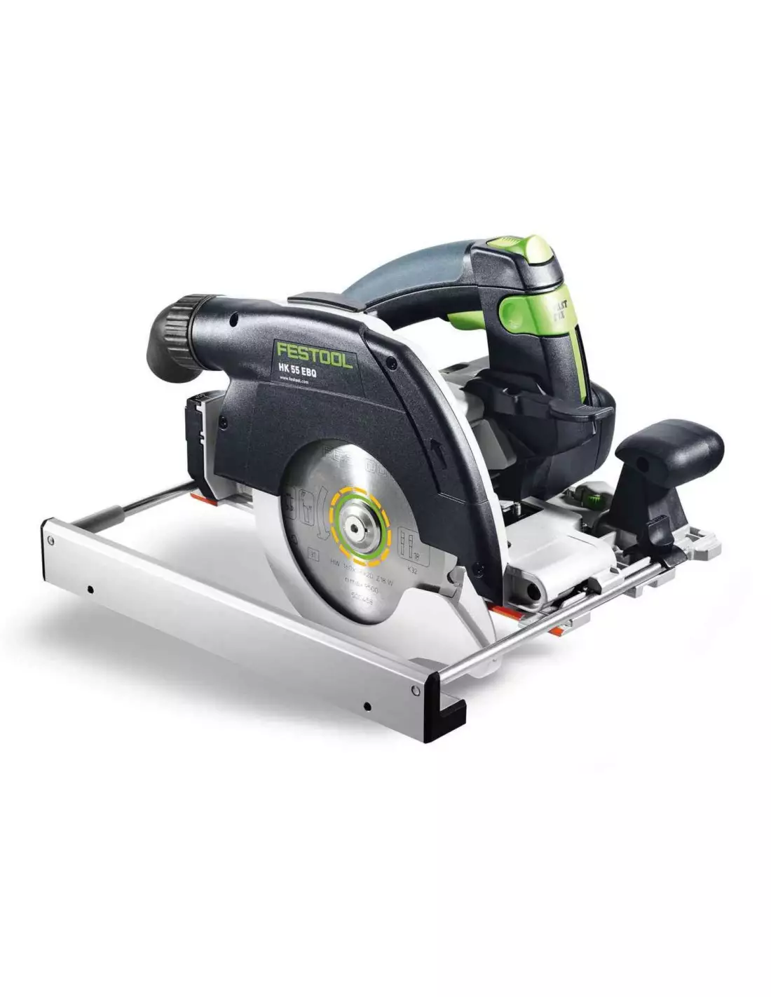 La scie circulaire portative hk 55 ebq-plus de festool est dotée du nouveau système de sciage qui associe l'efficacité, à une ergonomie optimisée et un maniement facile. les caractéristiques telles que le réglage de profondeur de coupe avec fonction de plongée, la commande à distance du capot basculant, la cale de guidage et le changement de lame de scie fastfix assurent des conditions de travail optimales. son moteur endurant de 1200 w offre une puissance régulière lors de l'usage. le rail de coupe d'onglets fsk permet d'effectuer des coupes précises et reproductibles. la scie circulaire portative hk 55 ebq-plus dispose également d'un réglage angulaire avec fixation centrale de 0 à 50°.