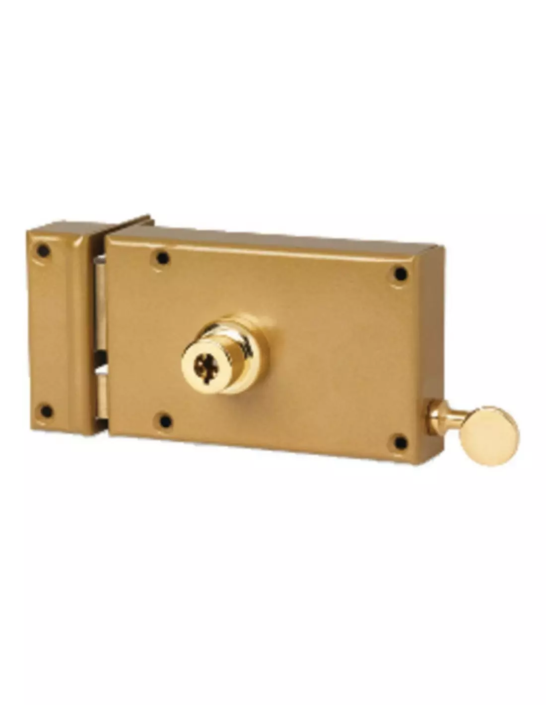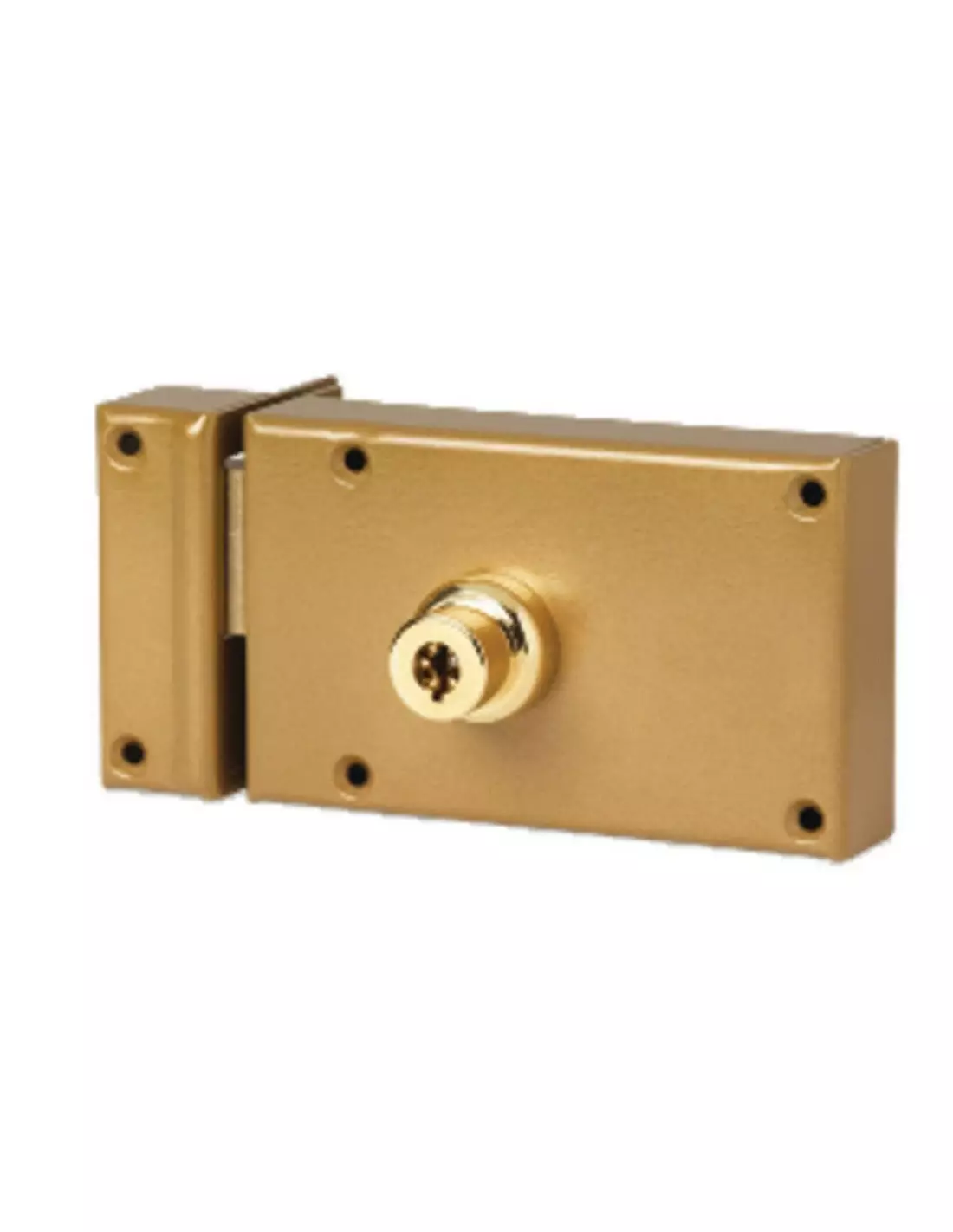 - Serrure 1 point en applique 5 ailettes à clé à pompe avec coffre et gâche en acier cambré couleur or 25/10ème.