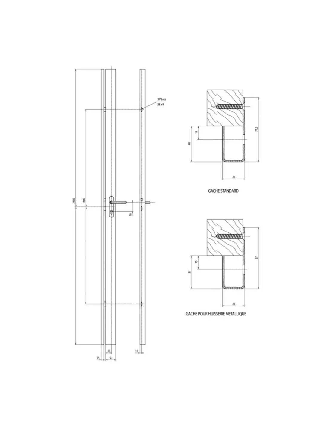 - 3 pênes dormants rectangulaires en acier anti-sciage.